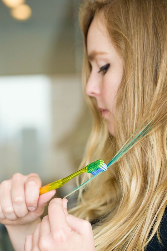 11. Nhuộm highlight cho tóc: Màu nhuộm có thể sẽ loang lổ hoặc dính khắp mái tóc, đặc biệt nếu nó ở dạng nước, vì thế hãy dùng bàn chải đánh răng để chấm màu, sau đó chải lên những tép tóc mà bạn muốn nhuộm màu.