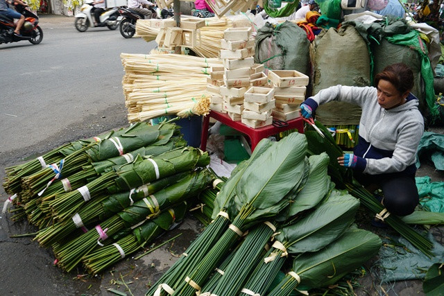 Nếu như những ngày 20 - 23 tháng chạp âm lịch, người mua lá đa phần là mua sỉ thì từ 25 - 27 tháng chạp âm lịch, khu bán lá lại nhộn nhịp người mua lẻ, mua lá về gói bánh cho gia đình để có không khí ngày xuân.
