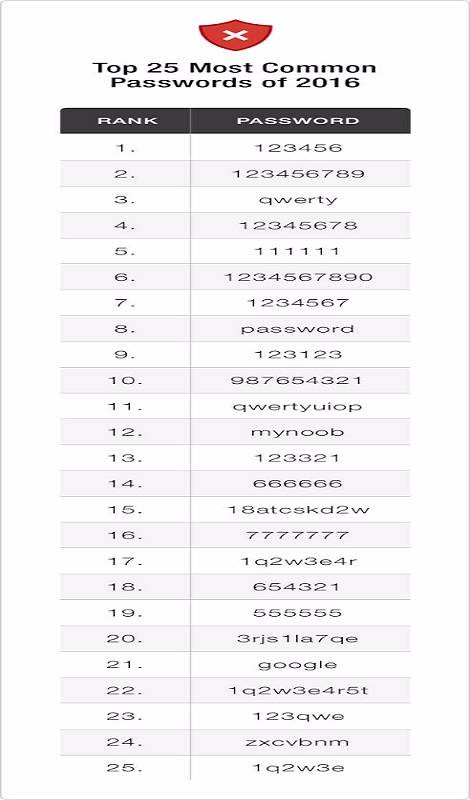 Theo thống kê của công ty bảo mật Keeper Security, 25 mật khẩu dưới đây được liệt vào danh sách phổ biến nhất trong năm 2016. Đây là những mật khẩu hết sức đơn giản, dễ đoán, và khiến giới hacker hoạt động rất nhàn hạ.