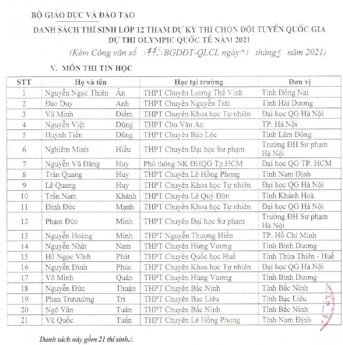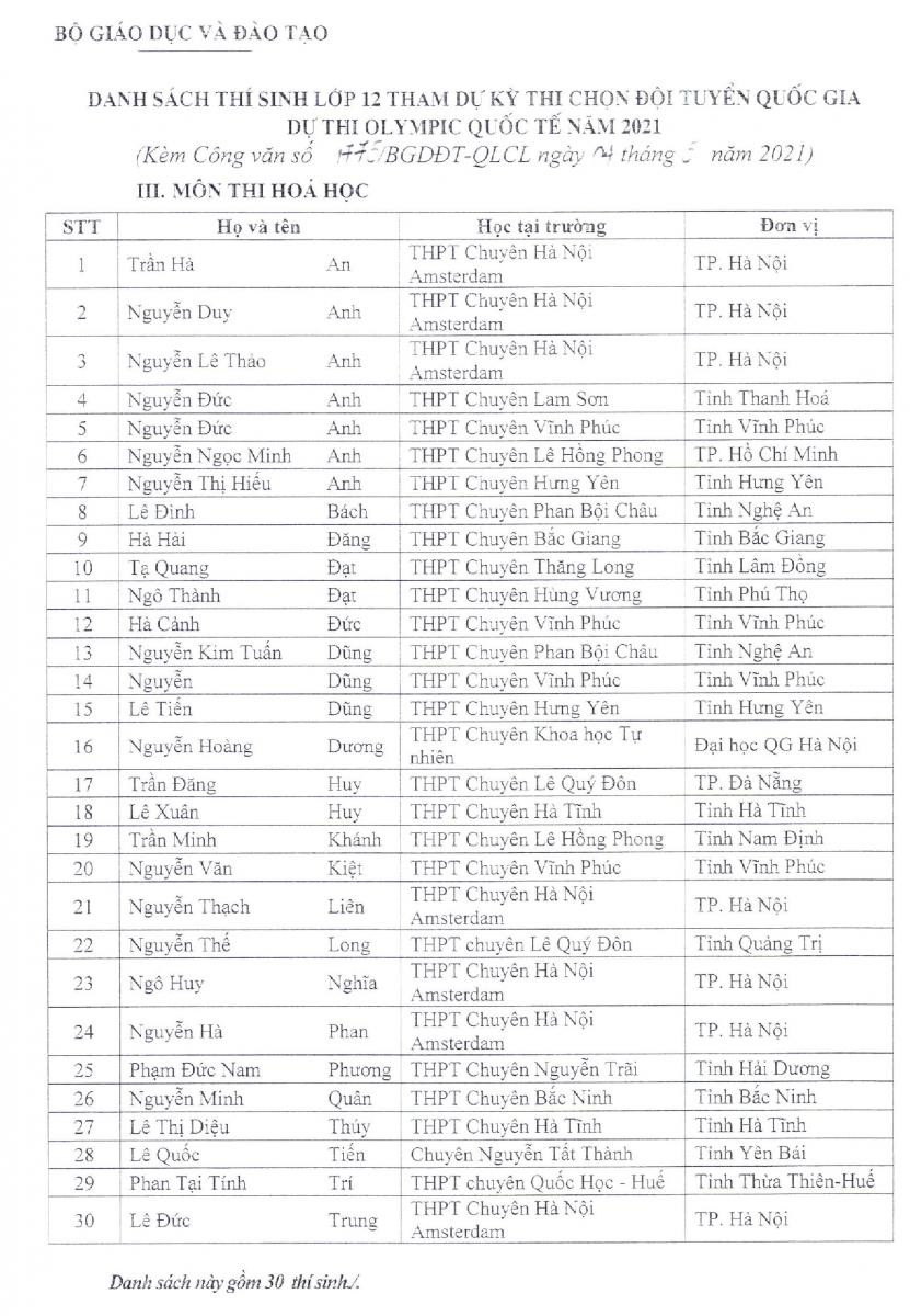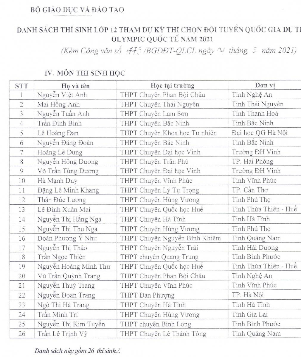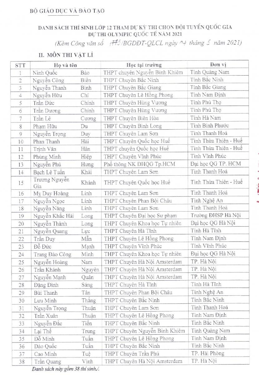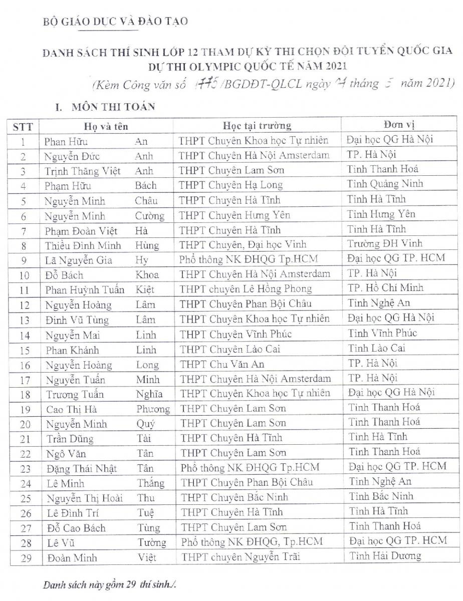 Danh sách 144 học sinh cụ thể như sau:Theo đó, Bộ GD - ĐT đề nghị các đơn vị nói trên thực hiện việc miễn Kỳ thi tốt nghiệp THPT và xét tuyển thẳng vào đại học, cao đẳng năm 2021 đối với 144 học sinh lớp 12 tham gia dự thi Kỳ thi chọn đội tuyển quốc gia dự thi Olympic quốc tế năm 2021.