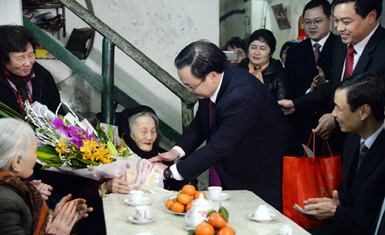 Trong ngày nhậm chức (5/2, tức 27 tháng Chạp), Ủy viên Bộ Chính trị - Bí thư Thành ủy Hoàng Trung Hải chúc tết Mẹ Việt Nam Anh hùng Trần Thị Lạc sinh năm 1918, ở 73 Phủ Doãn (quận Hoàn Kiếm), có 2 con là liệt sĩ, 1 con là thương binh (Ảnh: Kinh tế đô thị)