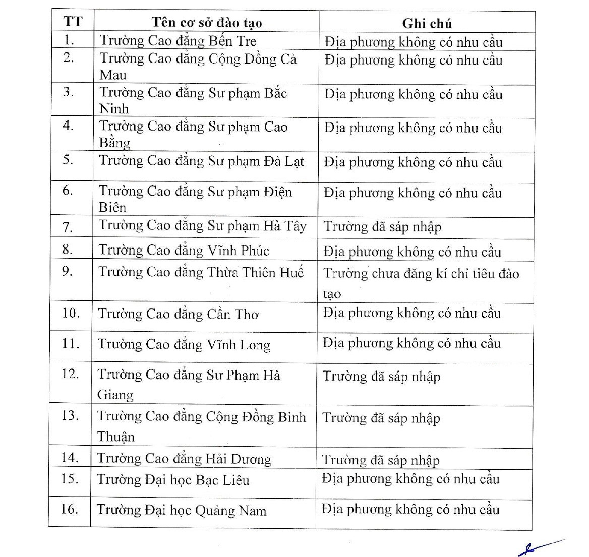 Như vậy, có 11 trường trực thuộc tỉnh thành không có nhu cầu đào tạo giáo viên gồm: Bến Tre, Cà Mau, Bắc Ninh, Cao Bằng, Lâm Đồng, Điện Biên, Vĩnh Phúc, Cần Thơ, Vĩnh Long, Bạc Liêu và Quảng Nam.