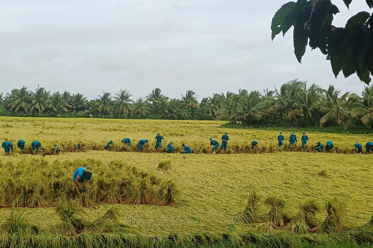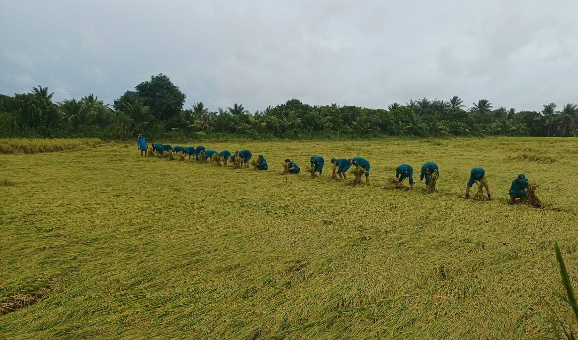 | Lực lượng quân sự giúp dân bó lúa đứng lên theo cụm để giảm thiểu thiệt hại. |