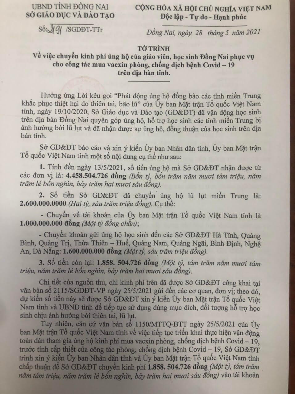 Theo báo cáo của Sở GDĐT Đồng Nai, Sở này tiếp nhận số tiền ủng hộ kể trên từ các trường, các Phòng GDĐT theo nhiều đợt (đến cuối tháng 5 này, Sở GDĐT mới quyết định ngưng tiếp nhận).