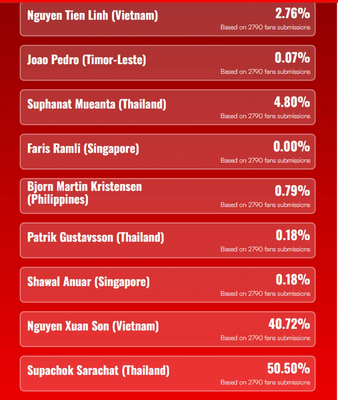 Thời điểm sáng 10/1, cái tên đang dẫn đầu cuộc bình chọn này là là Supachok của ĐT Thái Lan khi nhận được 50,50% bình chọn, trong khi tiền đạo Xuân Son (ĐT Việt Nam) có 40,72% bình chọn.