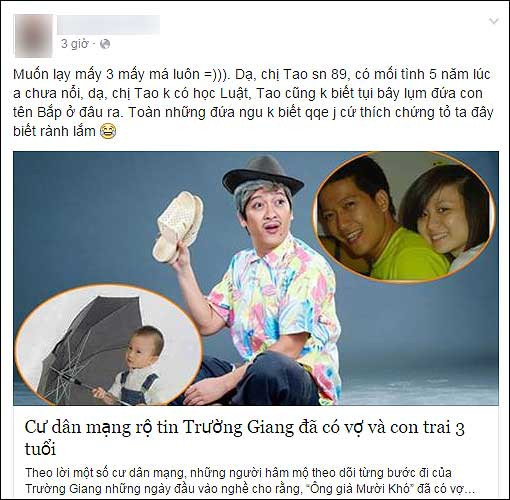 3. Trường Giang đã có vợ và con trai 3 tuổi?: Khi những ồn ào với Quế Vân lắng xuống chưa bao lâu thì thông tin Trường Giang có vợ và con trai 3 tuổi nổi lên lại khiến dư luận trở nên xôn xao. Ngay lập tức, cư dân mạng nhanh chóng tìm ra danh tính và facebook cá nhân của cô gái chụp ảnh cùng Trường Giang - người được cho là cô vợ mà anh đã cưới và có con cách đây nhiều năm.