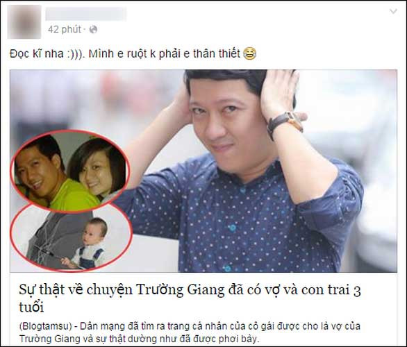 Sau đó, một tài khoản facebook đã xác nhận chị gái người này (sinh năm 1989) đúng là đã từng trải qua mối tình 5 năm với Trường Giang. Tuy nhiên, họ vẫn chưa hề cưới nhau hay có con riêng như nhiều người đồn đoán.