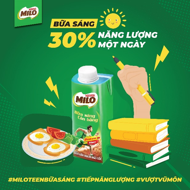 Bên cạnh đó, các bạn cũng nên chú ý đến chế độ ăn uống điều độ và lành mạnh. Các teen cần ăn đủ ba bữa sáng – trưa – tối mỗi ngày, ăn đúng giờ, nghỉ đúng giấc, uống nhiều nước, “nạp” nhiều rau xanh, nước ép trái cây,… để nâng cao sức đề kháng, hạn chế các món ăn không lành mạnh như thức ăn nhanh, trà sữa,…. Quan trọng nhất, các sĩ tử không được bỏ bữa sáng, vì bữa sáng là bữa ăn quan trọng nhất, cung cấp 30% năng lượng cho một ngày. Để giữ đầu óc minh mẫn, phong độ tự tin vượt “vũ môn” thành công ở giai đoạn nước rút này, teen hãy đảm bảo mình có một bữa sáng đầy đủ các chất dinh dưỡng và nhiều rau xanh. Teen cũng cần bổ sung thêm năng lượng nữa để không dễ dàng tuột sức. Một tip nhỏ, hãy bổ sung một hộp MILO Teen Bữa Sáng ’với protein, chất xơ, ít đường để tiếp thêm năng lượng, vượt “vũ môn” đại thành công.