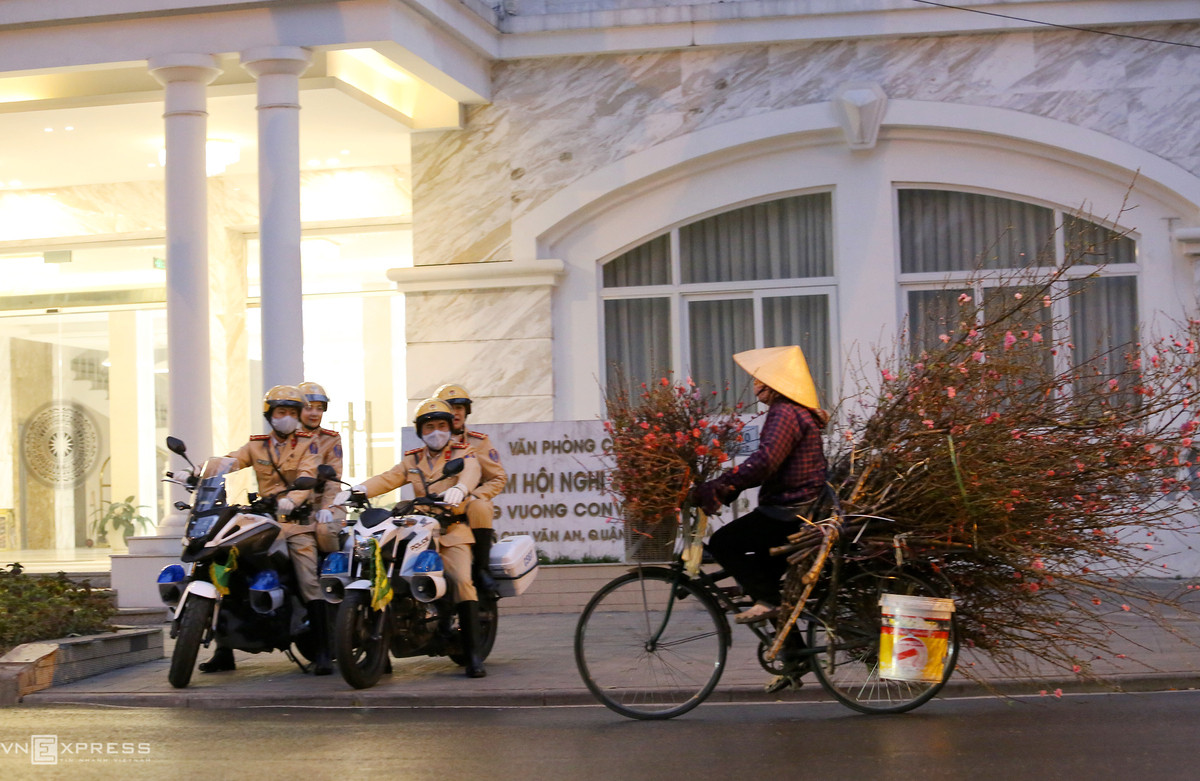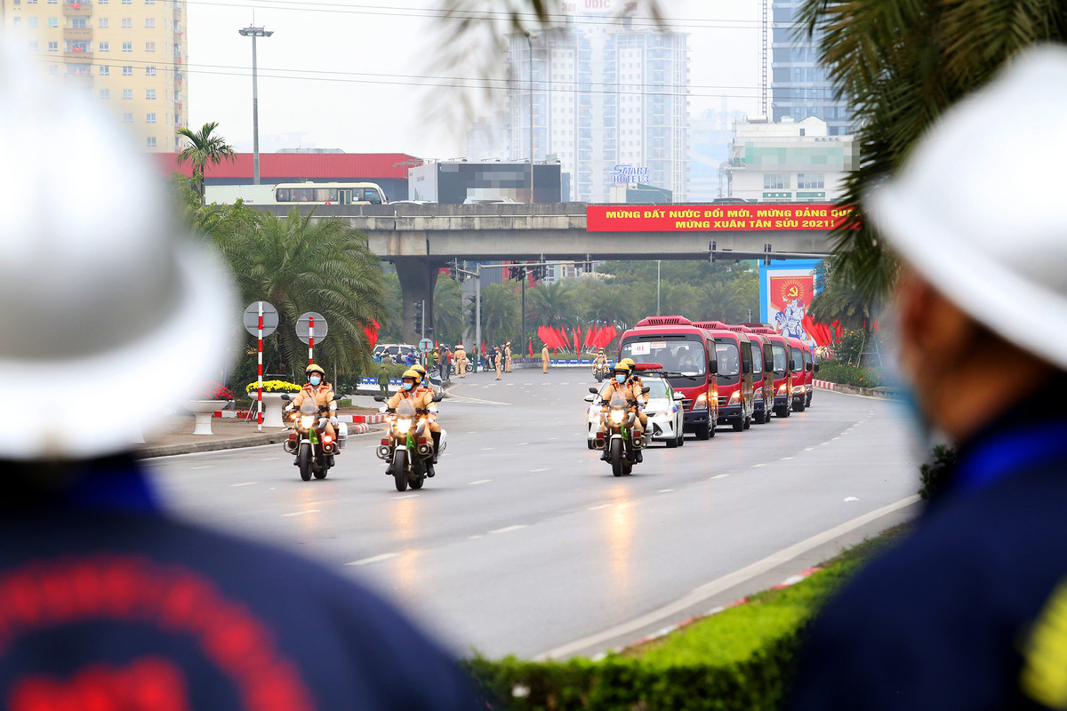 Trên đại lộ Thăng Long, xe dẫn đoàn của cảnh sát giao thông dẫn đầu, đi bên hông và đi cuối các đoàn xe khách, xe chở đại biểu từ trung tâm thủ đô tới Trung tâm Hội nghị Quốc gia.