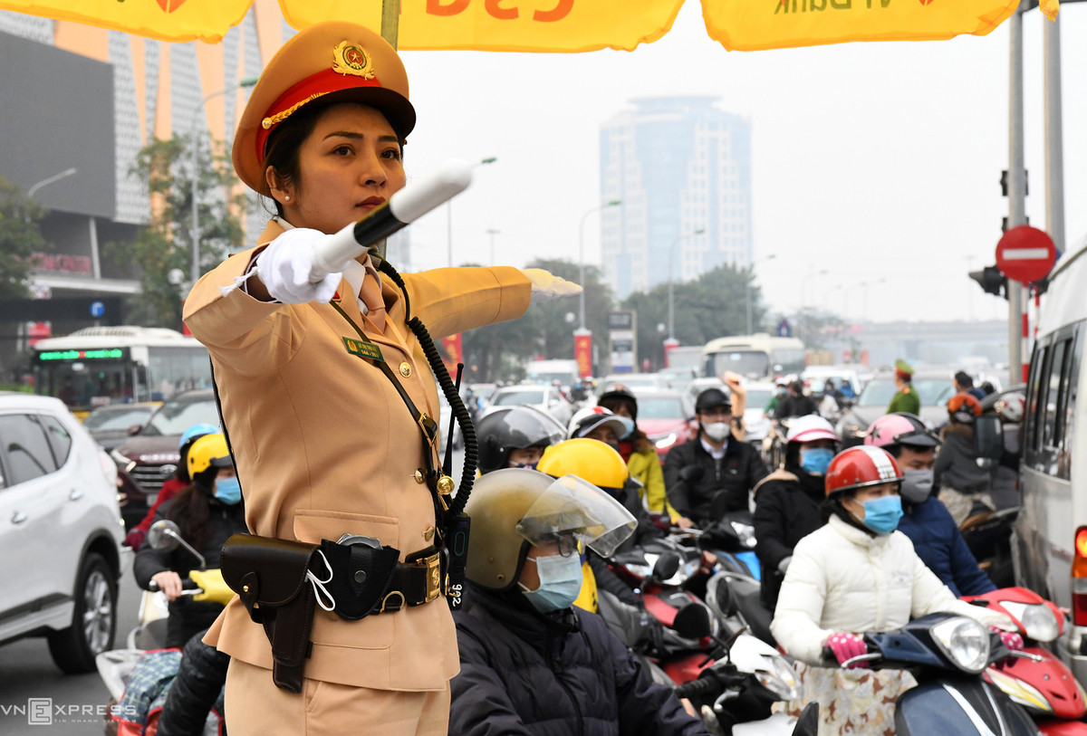 Nữ CSGT cùng nam đồng nghiệp dẫn đại biểu đi qua đường Trần Duy Hưng hôm 25/1. Video: Bá Đô