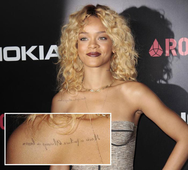 Rihanna có cả thảy 21 hình xăm trên người. Đặc biệt nhất là dòng chữ được xăm trên ngực phải, ngay dưới xương đòn "Never a Failure, Always a Lesson", có nghĩa là "Không bao giờ thất bại, luôn luôn là bài học". Nó được xăm vào tháng 12/2009 dưới dạng chữ viết ngược để khi cô nàng đứng trước gương thì có thể đọc mà tự nhắc nhở mình. Rihanna giải thích rằng cô luôn xem đây là châm ngôn sống của mình, không bao giờ xem các sự việc xảy ra là lỗi lầm mà là những bài học để rút kinh nghiệm.