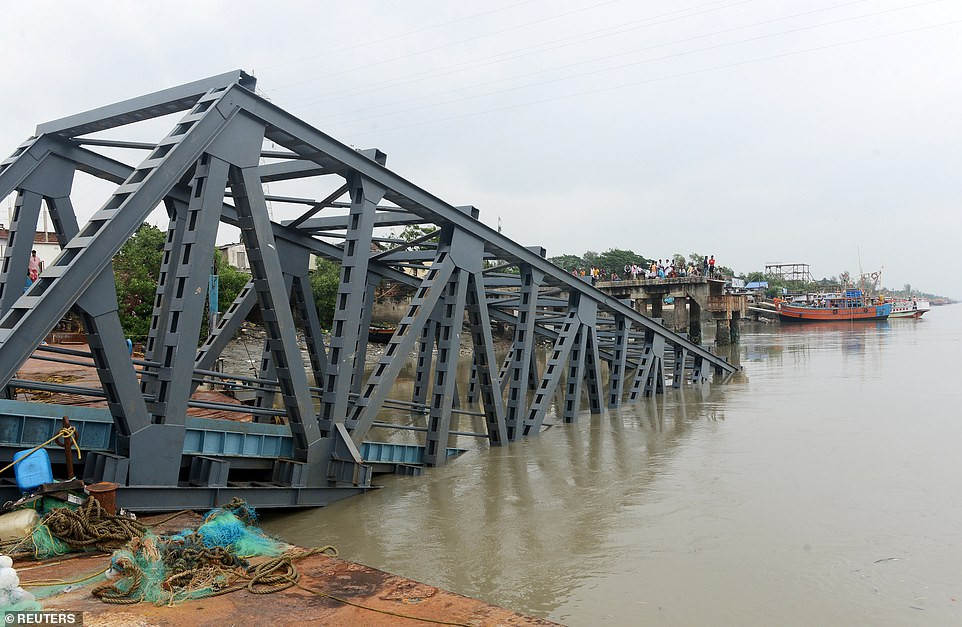 Theo Daily Mail, bão Bulbul đổ bộ vào đất liền hôm 9/11 với sức gió lên đến 120km/h. Nhiều hải cảng và sân bay ở cả Ấn Độ và Bangladesh đã bị đóng cửa. Trong ảnh: Một cây cầu ở Tây Bengal (Ấn Độ) bị gãy đổ do bão Bulbul.