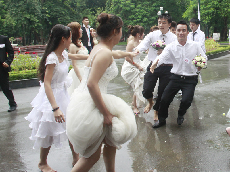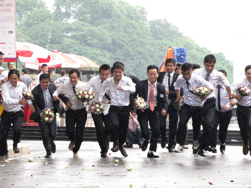 | Các chú rể cầm hoa cưới chạy về địa điểm nơi các cô dâu đang đợi. Sau khi nhận hoa cưới từ tay chú rể, cả hai cùng nắm tay nhau chạy về đích. |