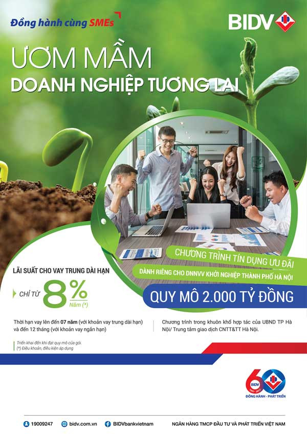 Ngân hàng TMCP Đầu tư và Phát triển Việt Nam (BIDV) vừa ban hành và chính thức triển khai chương trình tín dụng “Ươm mầm doanh nghiệp tương lai TP Hà Nội” với quy mô 2.000 tỷ đồng, lãi suất linh hoạt, thời hạn vay trung dài hạn lên đến 7 năm cùng nhiều ưu đãi khác….