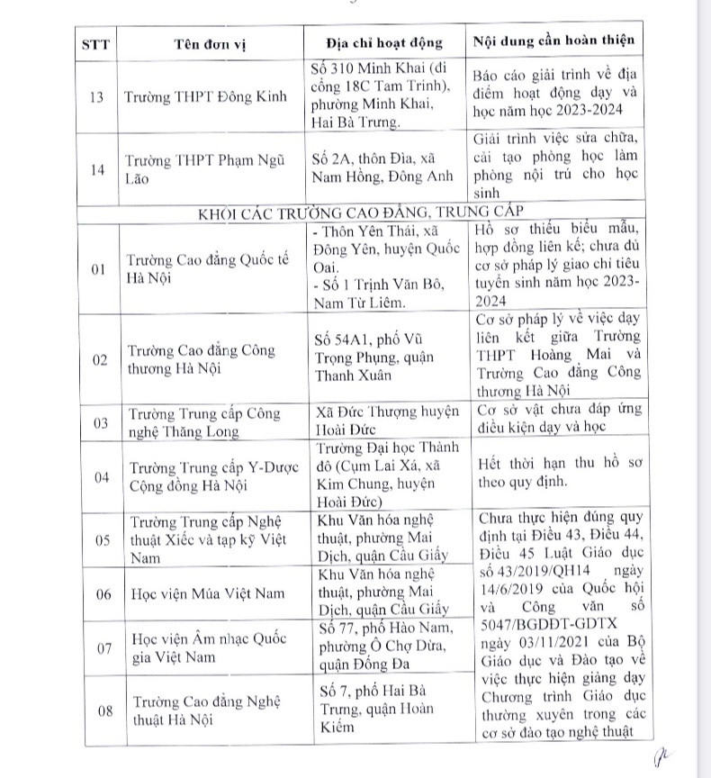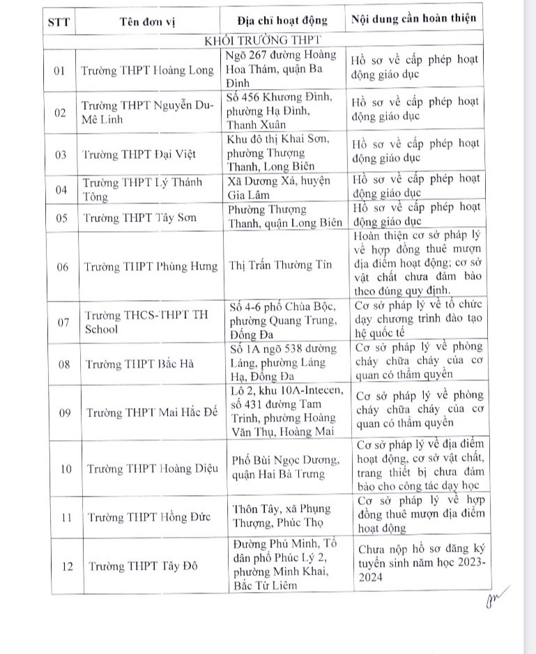 Trong thông báo cũng nêu ra yêu cầu mà các trường cần hoàn thiện như: Cơ sở vật chất, trang thiết bị; hồ sơ đăng ký tuyển sinh năm học 2023-2024 chưa có báo cáo giải trình về địa điểm hoạt động dạy và học; hồ sơ cấp phép hoạt động giáo dục; điều kiện cơ sở pháp lý về hợp đồng thuê mượn địa điểm hoạt động; cơ sở pháp lý về tổ chức dạy chương trình đào tạo hệ quốc tế;...