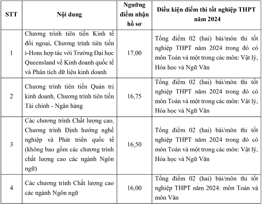 Trường Đại học Ngoại thương vừa công bố ngưỡng đảm bảo chất lượng đầu vào cho hai phương thức sử dụng điểm thi tốt nghiệp THPT.