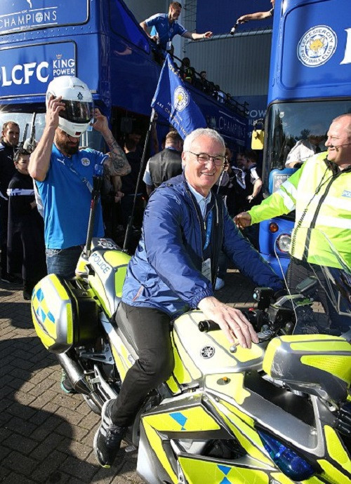 HLV Claudio Ranieri tạo dáng bên chiếc môtô mở đường của cảnh sát. Đây cũng là danh hiệu vô địch quốc gia đầu tiên của chiến lược gia người Italy.