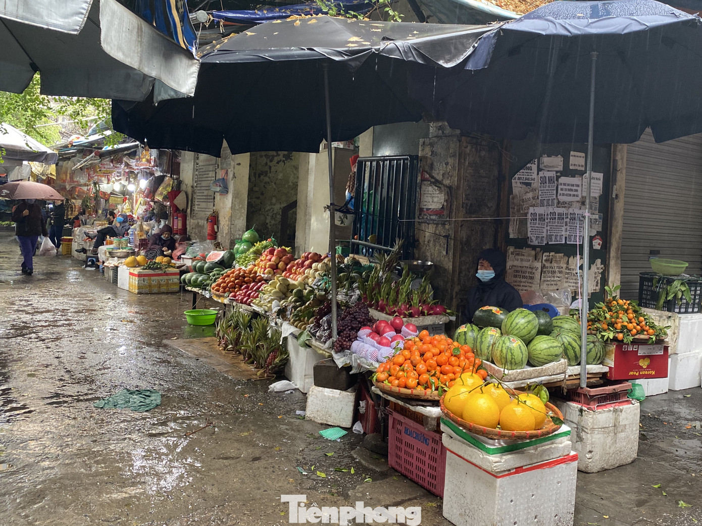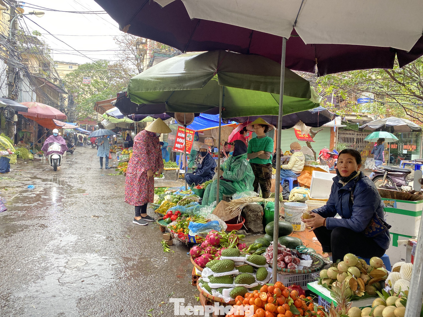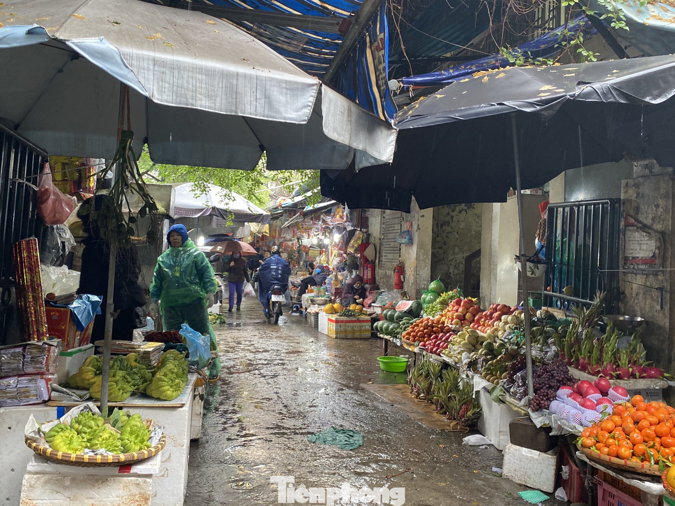 TPO - Mưa lớn tại Hà Nội khiến các chợ truyền thống vắng khách hơn thường lệ. Ngày 28 Tết, một số loại hoa quả bày mâm ngũ quả tăng giá gấp 5 lần. Chuối xanh 10.000 đồng/quả, đủ đủ xanh 30.000 đồng/quả nhỏ. Trầu cau 20.000 đồng/cơi