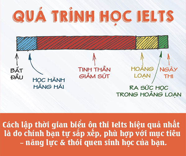 Để đạt được mục tiêu, thì việc lập kế hoạch rõ ràng là vô cùng cần thiết. Việc học ôn IELTS cũng vậy, bạn sẽ cần lên thời gian biểu phù hợp cho việc học - ôn - luyện đề. Các chuyên gia Cambridge nhận định, thông thường thời gian học IELTS trung bình mất khoảng 200 giờ học (có giáo viên hướng dẫn) để tăng 1 band điểm trong IELTS (ví dụ tăng từ 5.0 – 6.0). Tuy nhiên, với những bạn tự học IELTS (không có giáo viên hướng dẫn) thì thời gian trung bình bỏ ra có thể nhiều hơn 200 giờ. Chưa kể đến việc giải đề mẫu có thể tốn tối thiểu 120 giờ cho 14 quyển Cambridge IELTS.