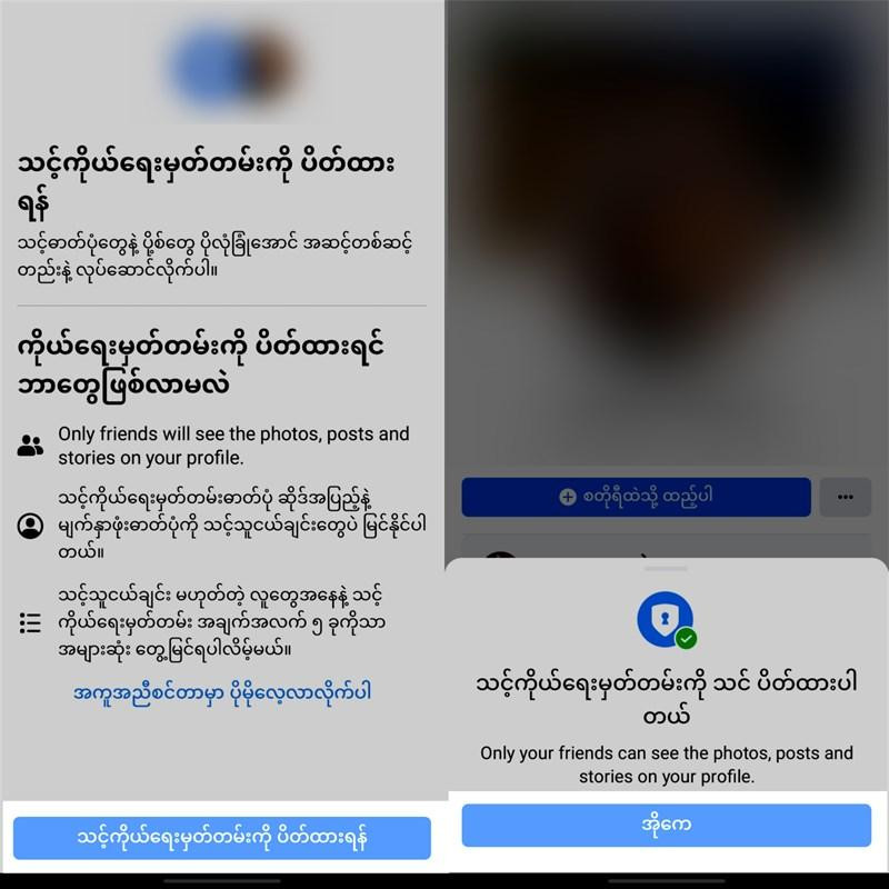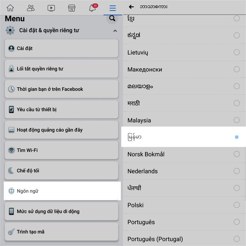 Đầu tiên người dùng vào phần cài đặt của trang cá nhân trên Facebook. Chọn theo đường dẫn Cài đặt và quyền riêng tư > Ngôn ngữ. Sau đó chọn ngôn ngữ မြန်မာဘာသာ.