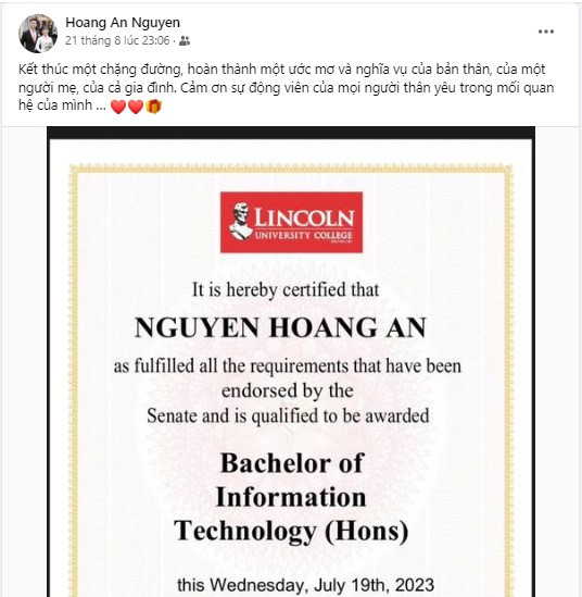 Chia sẻ thêm về quyết định của mình, An nói: “Lúc học, em biết được chương trình chuyển tiếp đại học từ Aptech TP. Hồ Chí Minh lên đại học Lincoln (Malaysia), mà thời gian đào tạo ngắn hơn ở Việt Nam. Thực tế là 2 năm Aptech cộng 1 năm lấy bằng đại học là siêu chất lượng”.