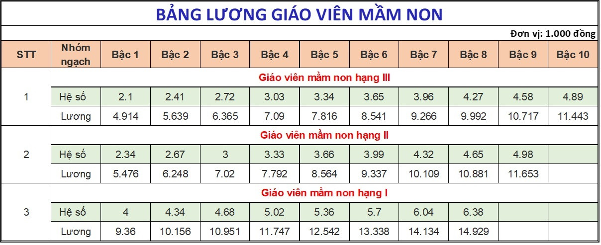 Có thể tham khảo bảng lương cơ bản giáo viên mầm non từ 1-7-2024 khi tăng lương cơ sở theo bảng này: