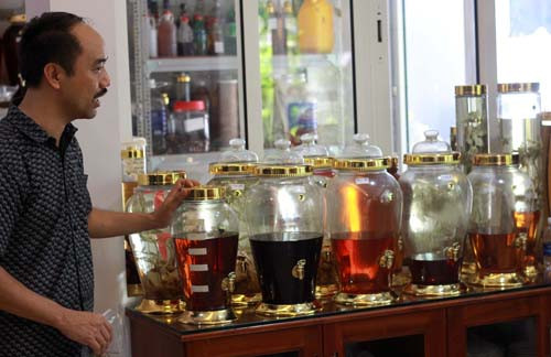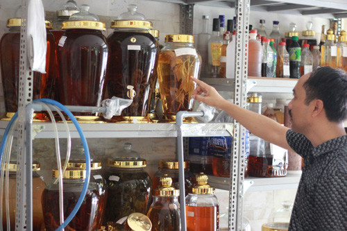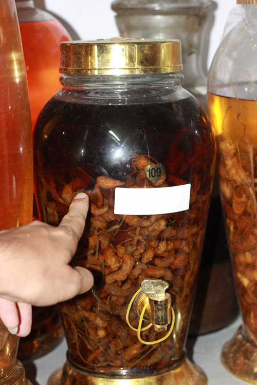 Cả trăm chiếc bình sâm được đặt trên những chiếc giá nhiều lớp, xếp chồng lên nhau từ mặt đất đến tận nóc nhà. Ông chủ kho sâm quý phải bắc chiếc ghế mấy bậc, trèo lên, giới thiệu với tôi về từng bình rượu, từng loại sâm khai thác ở các vùng khác nhau.