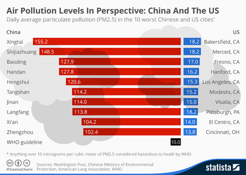 Bảng phía trên so sánh tình trạng môi trường ở 10 thành phố ô nhiễm nhất của Mỹ và Trung Quốc. Trong đó, yếu tố làm chuẩn so sánh là chỉ số PM2.5, đo nồng độ bụi ô nhiễm có đường kính 2,5 micromet trở lên, tính bằng lượng khói bụi (microgram) trên diện tích đơn vị (cubic met: m3).