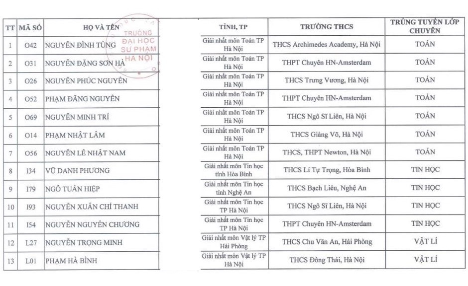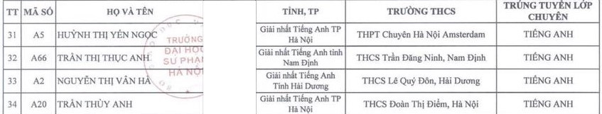 Theo đó, 34 học sinh đã được tuyển thẳng vào 7 lớp chuyên gồm: Toán học, Tin học, Vật lý, Hóa học, Sinh học, Ngữ văn và Tiếng Anh.