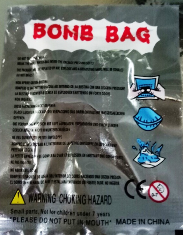 PV Dân trí đã tìm hiểu và được biết quả "bom thối" có vỏ ngoài bằng nilon, hình chữ nhật. Một mặt ghi chữ tiếng Anh: Boom, Fart Bomb và hình cậu bé bịt mũi xì hơi; mặt còn lại ghi dòng chữ to Bomb Bag và những dòng hướng dẫn cách chơi in bằng nhiều thứ tiếng; cảnh báo "không cho vào miệng", "không dành cho trẻ dưới 7 tuổi"... in bằng tiếng Anh, kèm hình ảnh hướng dẫn cách chơi. Trên túi cũng ghi rõ xuất xứ từ Trung Quốc.