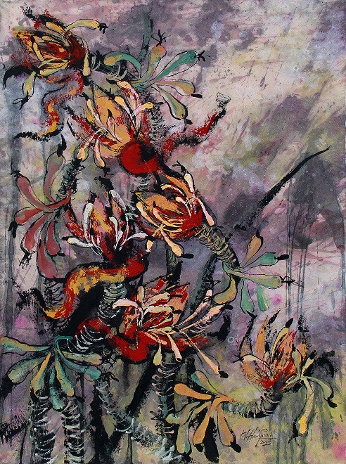 Đó là 38 tác phẩm vẽ bằng bột màu trên giấy dó mô tả vẻ đẹp kiêu sa, lạ nhưng cũng rất đỗi thân quen của hoa chuối rừng. Những bông hoa đa sắc màu biến hóa liên tục khi thì rực rỡ khoe sắc, khi thì e ấp, thấp thoáng, ẩn hiện trong màu xanh của núi rừng bát ngát.