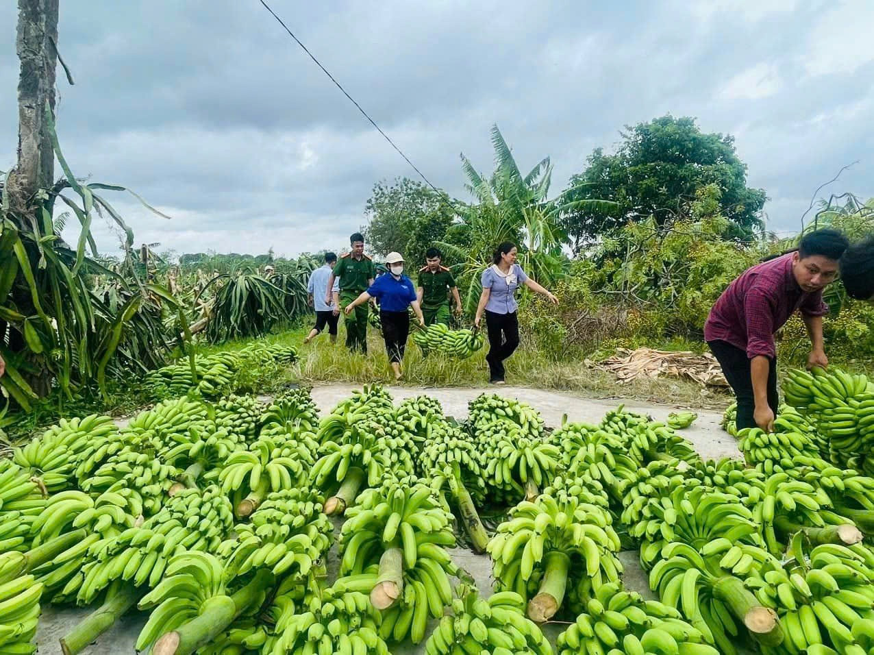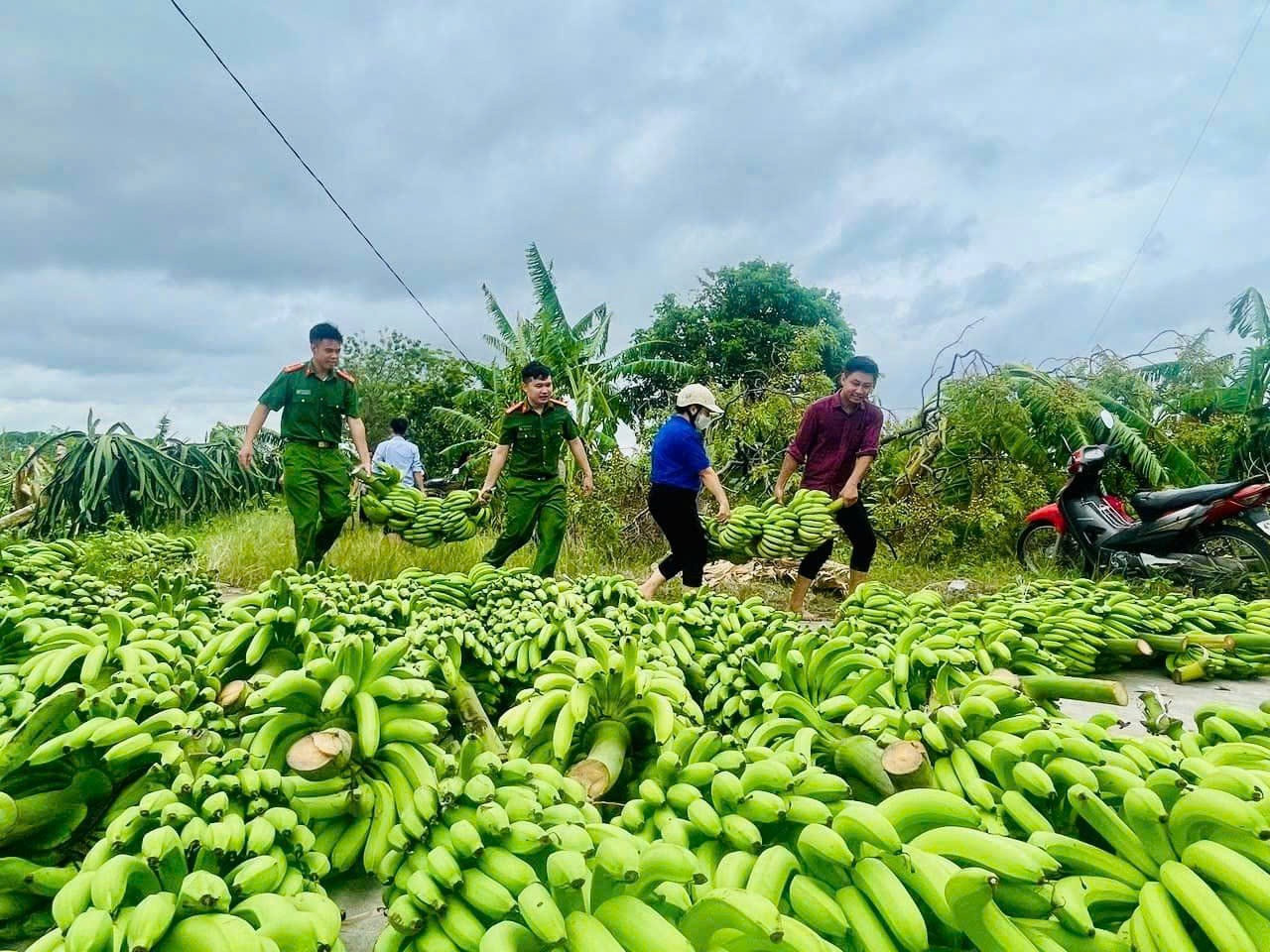 | Đoàn viên thanh niên hỗ trợ người dân thu hoạch chuối để bán ra thị trường. |