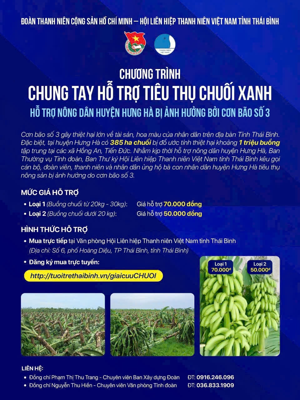 Tỉnh Đoàn – Hội LHTN Việt Nam tỉnh Thái Bình kêu gọi cán bộ, đoàn viên, thanh niên và cộng đồng ủng hộ người dân huyện Hưng Hà tiêu thụ nông sản bị ảnh hưởng bão số 3. Mức giá hỗ trợ, loại 1 (buồng chuối từ 20 – 30kg) là 70.000 đồng. Loại 2 (buồng chuối dưới 20kg) là 50.000 đồng.