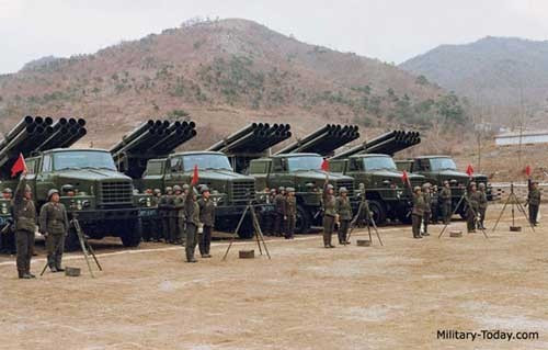 Hệ thống pháo phản lực phóng loạt M1991 của Triều Tiên được trang bị giàn phóng 22 nòng cỡ 240 mm, bắn những viên đạn nặng 407 kg ở khoảng cách 43 km. Tương tự M1989, M1991 thừa khả năng đe dọa Seoul. Ảnh: Military Today.