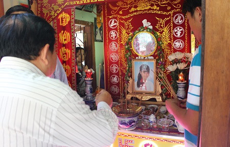 Nhìn di ảnh Quyên với mái tóc đen óng dài, cổ khăn quàng đỏ… không ai cầm được nước mắt. Trong sáng ngày 5/5, nhiều thầy cô, bạn bè của em cũng đã đến chia buồn cùng gia đình.