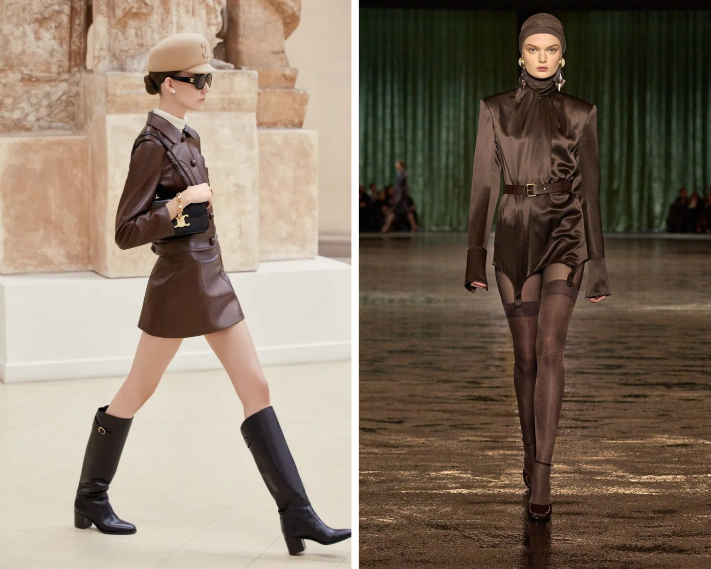 Trong khi Bottega Veneta và Jason Wu chọn màu nâu cho những chiếc váy bất đối xứng, thì Miu Miu và Max Mara đã dùng màu này cho các bộ skirt suit. Đồng thời, Luar và Celine cũng đã phủ màu nâu lên các thiết kế áo khoác, áo và chân váy da.