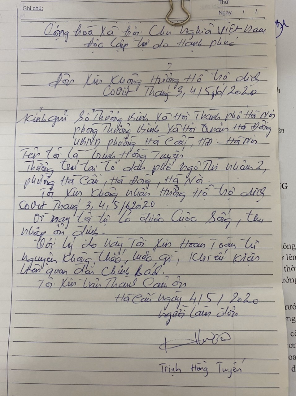 “Xúc động nhất có trường hợp từ chối nhận hỗ trợ. Đó là trường hợp bác Trịnh Hồng Tuyến, mặc dù được hưởng trợ cấp theo diện người có công với khoảng 1 triệu đồng/tháng trong 3 tháng nhưng bác đã viết đơn xin không hưởng trợ cấp, nhường lại tiền hỗ trợ cho người khó khăn hơn”, bà Thảo cho hay.