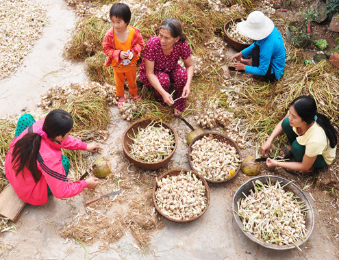 Trung bình mỗi sào 500m2 cho thu hoạch khoảng 600kg tỏi thì chỉ có khoảng 2 kg, nhiều nhất cũng chỉ 5kg tỏi một tép. Sau khi đưa về nhà, người dân cắt tỉa cành lá, phơi tỏi mồ côi ở mái tôn trên nóc nhà. Tỏi khô giòn, họ gom cho vào thùng kín có lót lá sơn (loại lá cây chống ẩm, mối mọt) để bảo quản, dự trữ loại nông sản này quanh năm mà không bị hư hỏng, tổn thất.