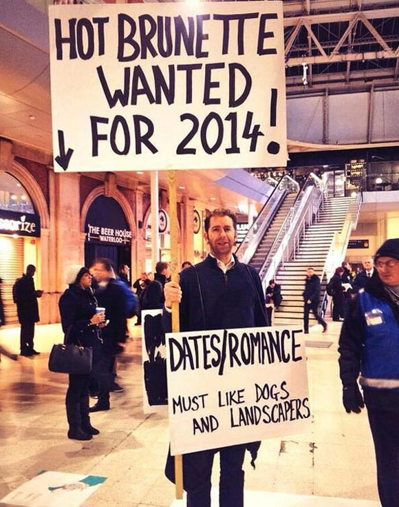 Trên hai tấm biển ghi rõ yêu cầu tiêu chuẩn của anh về bạn gái, một tấm ghi nội dung “tìm cô gái tóc hung cho năm 2014” và một tấm thì viết “thích chó và những người trồng hoa”.
