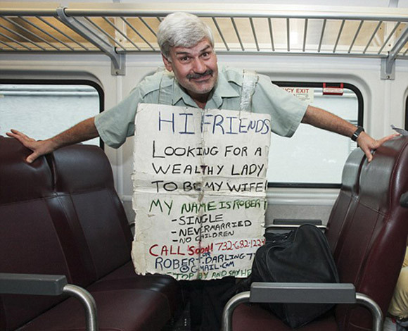 Trên người ông đeo tấm bảng với nội dung: "Tìm kiếm một người phụ nữ giàu có để làm vợ. Tên tôi là Robert: độc thân, chưa lập gia đình và không có con".