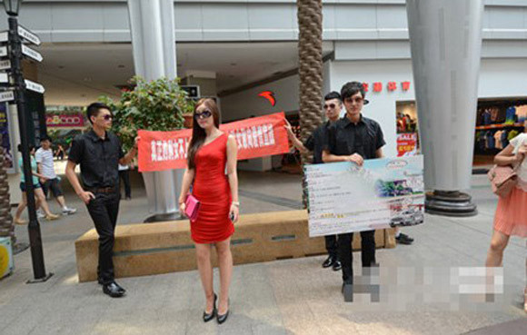 Cô xuất hiện tại một quảng trường lớn, ăn mặc nổi bật đi cùng 3 chàng vệ sĩ cầm theo tấm băng rôn có nội dung tìm kiếm chồng. Trên đó ghi các thông tin đáng mơ ước về cô như mới du học Canada về, mới ngoài 20 tuổi nhưng đã quản lý một công ty, lương khoảng 300.000 tệ/năm (khoảng 990 triệu đồng VN) và có một biệt thự, một chiếc xe Mercedes.