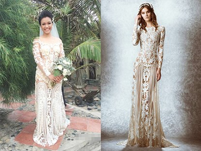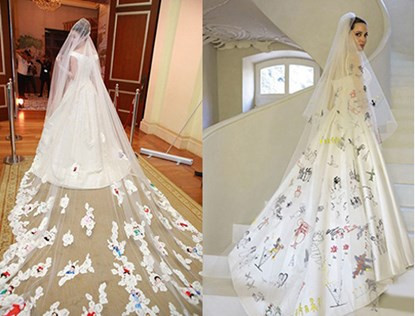 Chiếc váy trăm triệu tới từ thương hiệu Oscar de la Renta của nữ diễn viên Ngân Khánh cũng từng là đề tài bàn tán của dư luận trong thời gian gần đây. Ngoài giá trị quá lớn của chiếc váy thì chiếc voan trùm đầu được thêu hình những đứa trẻ trong gia đình của Ngân Khánh bị xem là đã bắt chước ý tưởng thêu tranh vẽ của các con lên áo cưới của nữ diễn viên Angelina Jolie.