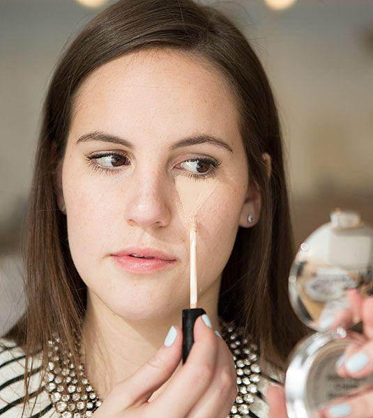 Để làm sáng vùng da dưới mắt của mình, hãy ngừng chấm kem che khuyết điểm theo hình vòng cung theo quầng thâm mà hãy thử vẽ một hình tam giác ngược dưới mắt. Kéo dài phần chóp nhọn đến giữa má và tô hết hình tam giác. Cách này sẽ giúp che giấu hoàn toàn phần quầng thâm và bọng mắt, thậm chí tạo cảm giác vùng dưới mắt sáng và tươi tắn hơn.