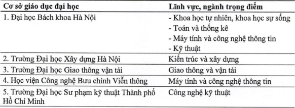 Năm cơ sở giáo dục đại học được Chính phủ đầu tư để phát triển kỹ thuật, công nghệ trong giai đoạn tới gồm: Đại học Bách khoa Hà Nội, trường Đại học Xây dựng Hà Nội, trường Giao thông vận tải, trường Đại học Sư phạm kỹ thuật TP.HCM, học viện Công nghệ Bưu chính viễn thông.