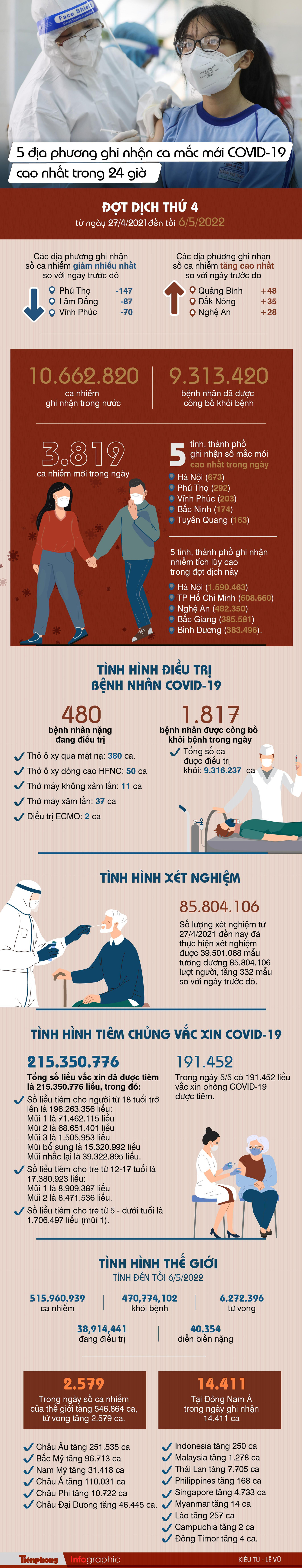 TPO - Kể từ đầu dịch đến nay Việt Nam có 10.670.570 ca nhiễm, đứng thứ 12/227 quốc gia và vùng lãnh thổ, trong khi với tỷ lệ số ca nhiễm/1 triệu dân, Việt Nam đứng thứ 104/227 quốc gia và vùng lãnh thổ (bình quân cứ 1 triệu người có 107.840 ca nhiễm).