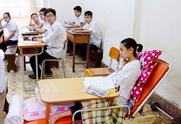 2. Thí sinh 14 tuổi làm bài thi trên giường bệnh. Do bị tai nạn giao thông nên cả 2 buổi thi vào lớp 10 THPT năm nay của Hà Nội, em Đào Kiều Khánh, 14 tuổi, học sinh Trường THCS Tô Hoàng (quận Hai Bà Trưng, Hà Nội), thi tại điểm thi THPT Trần Phú (quận Hoàn Kiếm) được bố trí ngồi ở cuối cùng phòng thi. Trong 120 phút, em vừa làm bài vừa được truyền nước. Có một nhân viên y tá luôn theo sát em để chăm sóc.