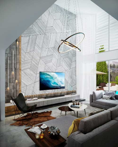 Trong thiết kế mới đây, kiến trúc sư Nguyễn Thanh Đạt đã sử dụng mẫu TV LG Oled 7W kích thước 77 inch, phù hợp với khoảng cách đến sofa cũng như bàn ăn. Mẫu TV tinh giản nhưng nổi bật khi bố trí trên bức tường điêu khắc bằng đá marble vân kẻ sọc. Đồng thời, kiến trúc sư khéo cũng léo chọn mẫu sofa lưng tựa thấp để đảm bảo tầm nhìn rộng thoáng đến các không gian khác trong nhà.
