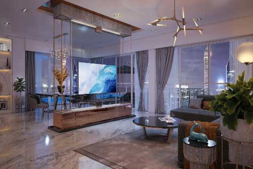 Quỹ đất chật hẹp nên các căn hộ chung cư hoặc penthouse thường tích hợp phòng khách, phòng ăn, bếp nấu trong cùng không gian mở. Nếu muốn nơi đón tiếp bạn bè thêm riêng tư, gia chủ nên bài trí vách ngăn có thiết kế kiểu cách, thay thế cho tường gạch truyền thống nặng nề và tù túng.