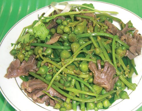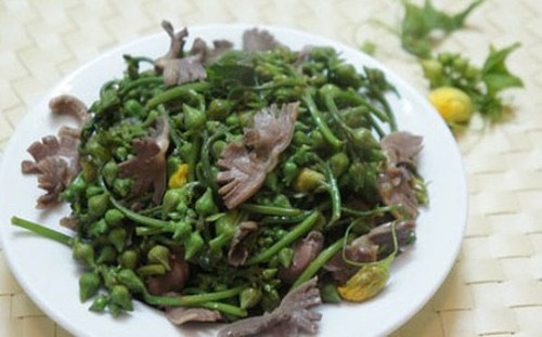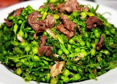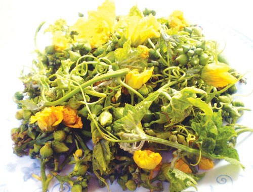 Hoa mướp xào bò. Đây là món ngon lạ miệng, rất hấp dẫn. Thịt bò sau khi thái lát mỏng, ướp với hạt nêm, gia vị, dầu ăn cho ngấm. Hoa mướp sau khi rửa sạch, cho vào nước sôi trần qua để giữ được màu xanh khi xào. Ảnh: gocnhosantruong