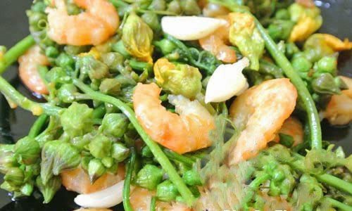 Tôm xào hoa mướp. Vị hơi nhặng đắng đặc trưng của hoa mướp kết hợp với vị ngọt của tôm làm cho món ăn trở nên thú vị. Tôm bóc vỏ, bỏ đầu rồi ướp với 1 chút hạt nêm. Hoa mướp rửa sạch, để ráo. Ảnh: blogamthuc